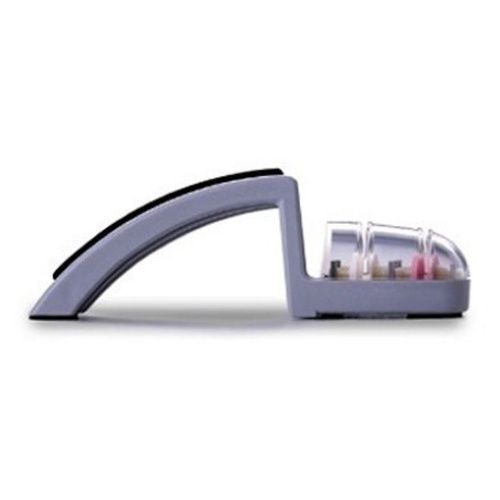 This effective and simple to use sharpener is suitable for all knives except those that are sharpened on one side only. It consists of two ceramic wheels - a white one that's coarse and a pink one that completes the sharpening process. The extra large ceramic wheels sharpen the maximum surface area of the blade at the perfect angle for a longer lasting razor sharp edge. It also operates with the use of water which keeps the ceramic wheels rinsed. Once filled with water, hold the sharpener flat on your countertop, firmly gripping one side to keep it steady. Holding the knife with your other hand, position the blade perpendicular into the groove with the white coarse wheel and move back and forth. Repeat with the pink finishing wheel. No heavy pressure is necessary. After sharpening, hand wash knife in hot water and dry completely