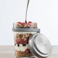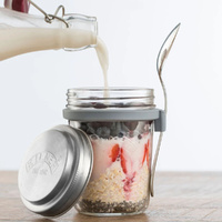 The durable Kilner glass jar features a wide mouth for easy filling and cleaning, while the airtight lid helps keep contents fresh. A stainless steel lid insert provides a separate storage space for toppings such as granola, nuts, or dried fruit, keeping them crisp until ready to serve.