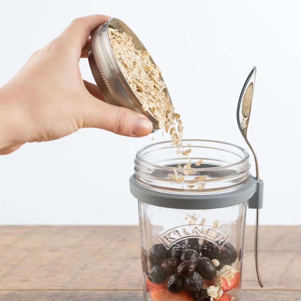 Each durable Kilner glass jar features a wide mouth for easy filling and cleaning, while the airtight lid helps keep contents fresh. A stainless steel lid insert provides a separate storage space for toppings such as granola, nuts, or dried fruit, keeping them crisp until ready to serve.