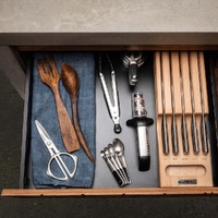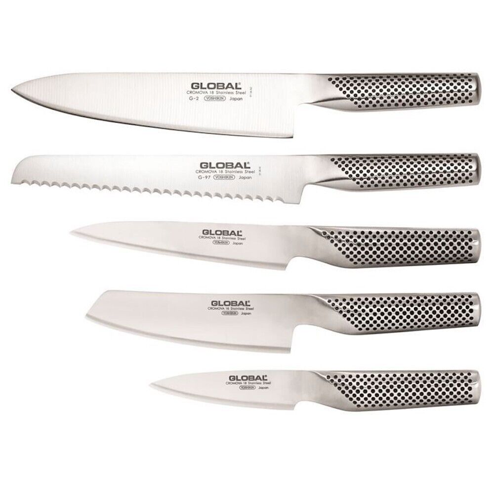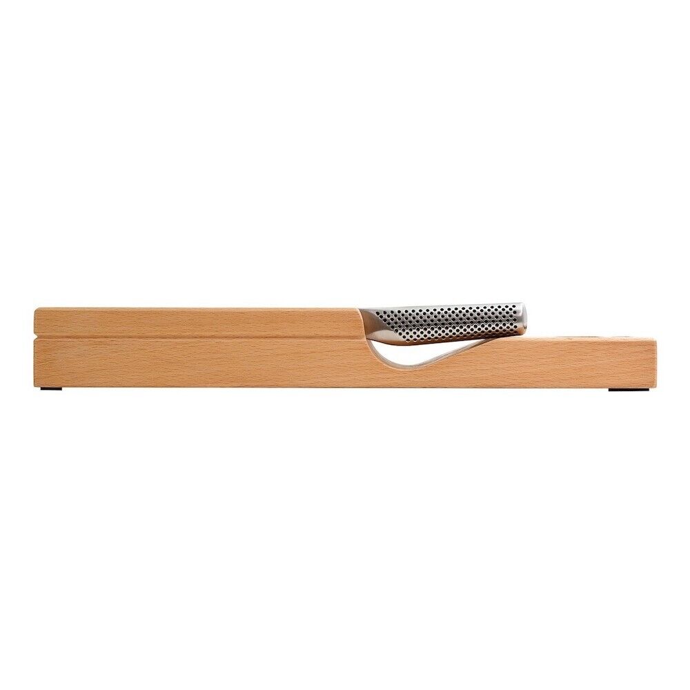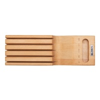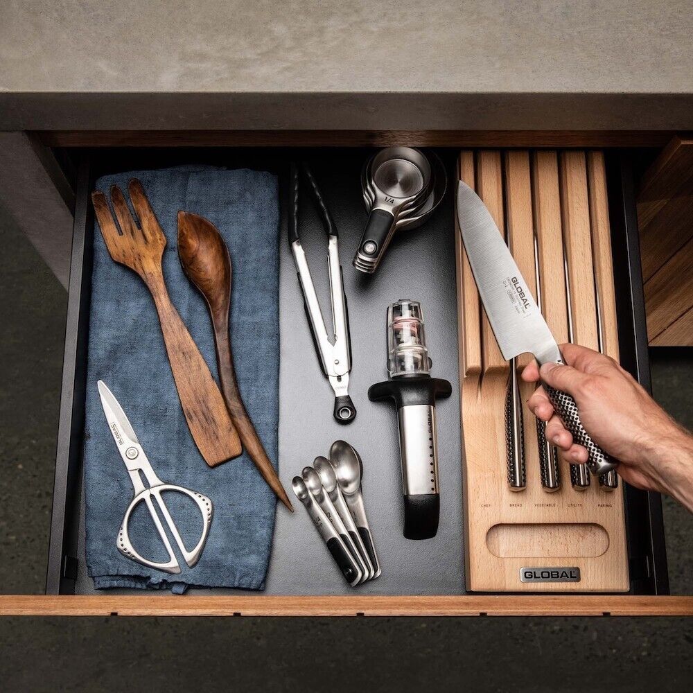 The Hikaeme In-Drawer Cutlery Set inludes 5 best selling knives all house in a beechwood storage unit. This beechwood unit includes markings near the handle to help easily identify each blade and includes a finger pull to easily remove the set from the drawer. GLOBAL knives are made from CROMOVA 18 stainless steel, specially developed by GLOBAL as it holds a razor-sharp edge longer than any other steel and resists rust, stains and corrosion. Ice tempered and hardened to Rockwell C56-58, each knife is carefully weighted for optimum performance and balance. Other unique features include its smooth contours and seamless construction which eliminates food and dirt traps offering the ultimate in safety and hygiene. The acute 15-degree angle cutting edge provides unsurpassed performance and superior edge retention. The name HIKAEME translates to "discreet" in Japanese as the knives are hidden in the drawer, allowing more bench space for prep work. When purchasing any GLOBAL knife block set, we strongly recommend investing in a ceramic water sharpener or whetstone in order to maintain your knives and keep them razor sharp.