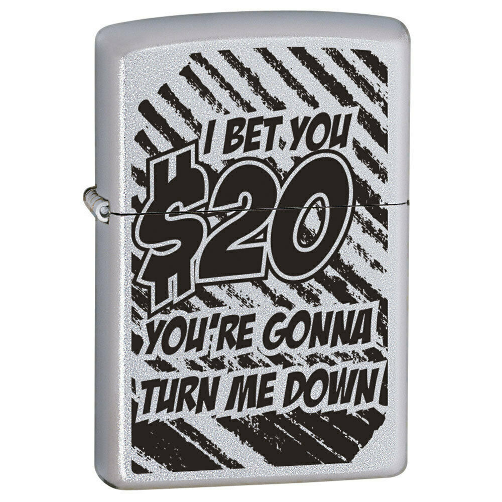 This I Bet You $20 Zippo Lighter features a Satin Chrome Finish, and is a genuine Zippo product and comes packaged in an environmentally friendly Zippo Gift Box directly from the Zippo Manufacturing Company. Every Zippo product we sell is brand new, sealed in Zippo’s original packaging.