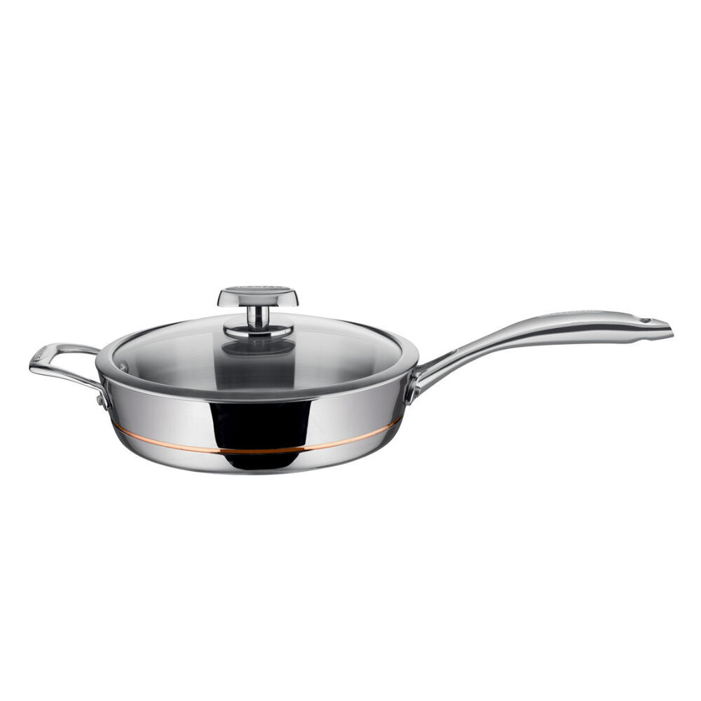 Scanpan Axis makes cooking even easier by combining the superior heat performance of copper with the durability and convenience of stainless steel. Featuring exclusive 5-layer / 3-ply construction with a copper core, this sauté pan delivers fast, even heat distribution with no hot spots. The professional-quality stainless steel body has sealed edges to eliminate aluminium exposure, while the satin-finish interior includes capacity markings for precise cooking. Complete with a dome tempered glass lid for easy monitoring, this versatile pan is compatible with all cooktops, including induction.