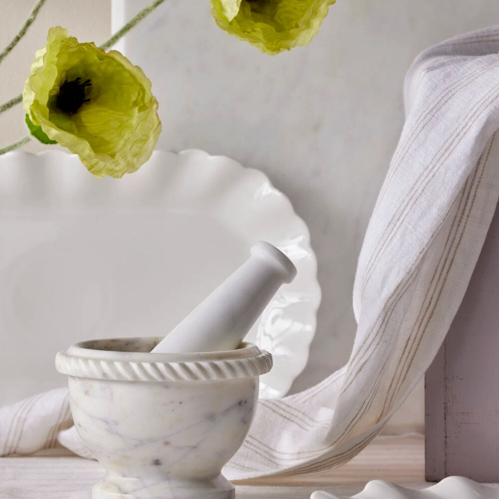 The Society Home Margot Marble Mortar & Pestle combines elegance with practicality, making it a stylish addition to any kitchen. Crafted from durable marble with a classic white finish, it features a decorative scalloped edge that adds a refined, heritage-inspired look while remaining highly functional for everyday food preparation.