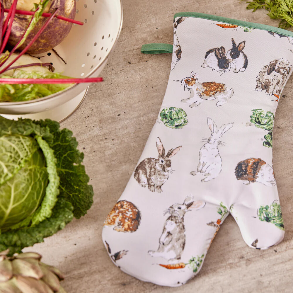 The Rabbit Patch range by Ulster Weavers features charming bunnies that will hop their way into your favourite kitchen staples. Wrapped in 100% cotton, this Gauntlet Glove protects your hand when handling hot dishes with thick, protective wadding. The print features playful bunnies with floppy ears, twitchy noses and inquisitive expressions, plus pops of green cabbages and carrots for added detail.