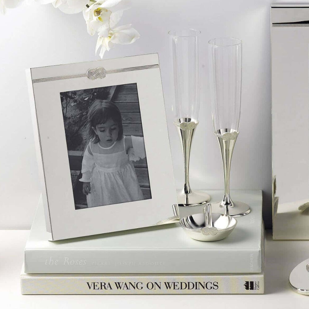 The Vera Wang Infinity Ring Catcher is crafted in silver-plated metal, featuring the signature braided loop-knotted rope motif from the “Infinity” collection — symbolising enduring love and unity. Perfect as a keepsake or gift for a meaningful occasion.