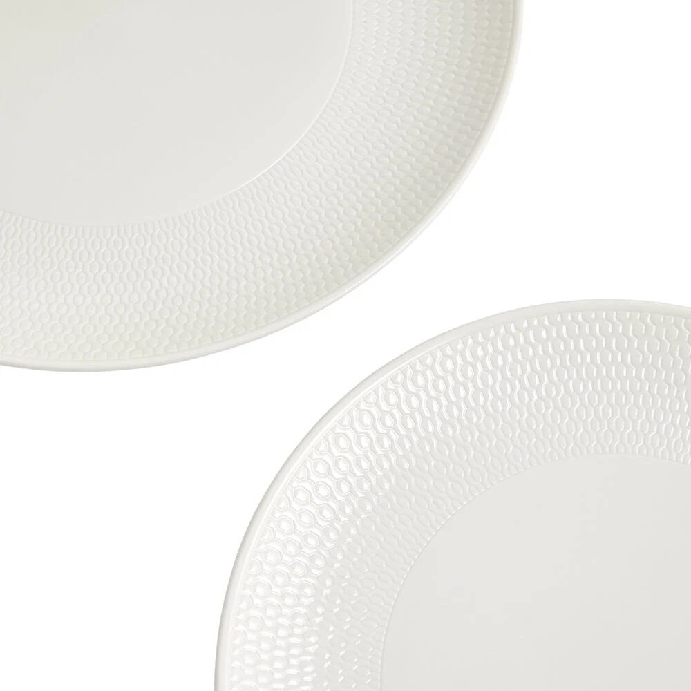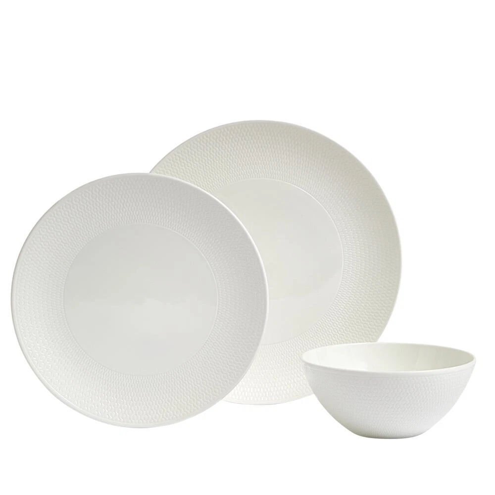 The Wedgwood Gio 12 Piece Set features a clean, contemporary design with an embossed geometric pattern, crafted from fine bone china. This set offers a versatile and elegant foundation for everyday dining or special occasions.